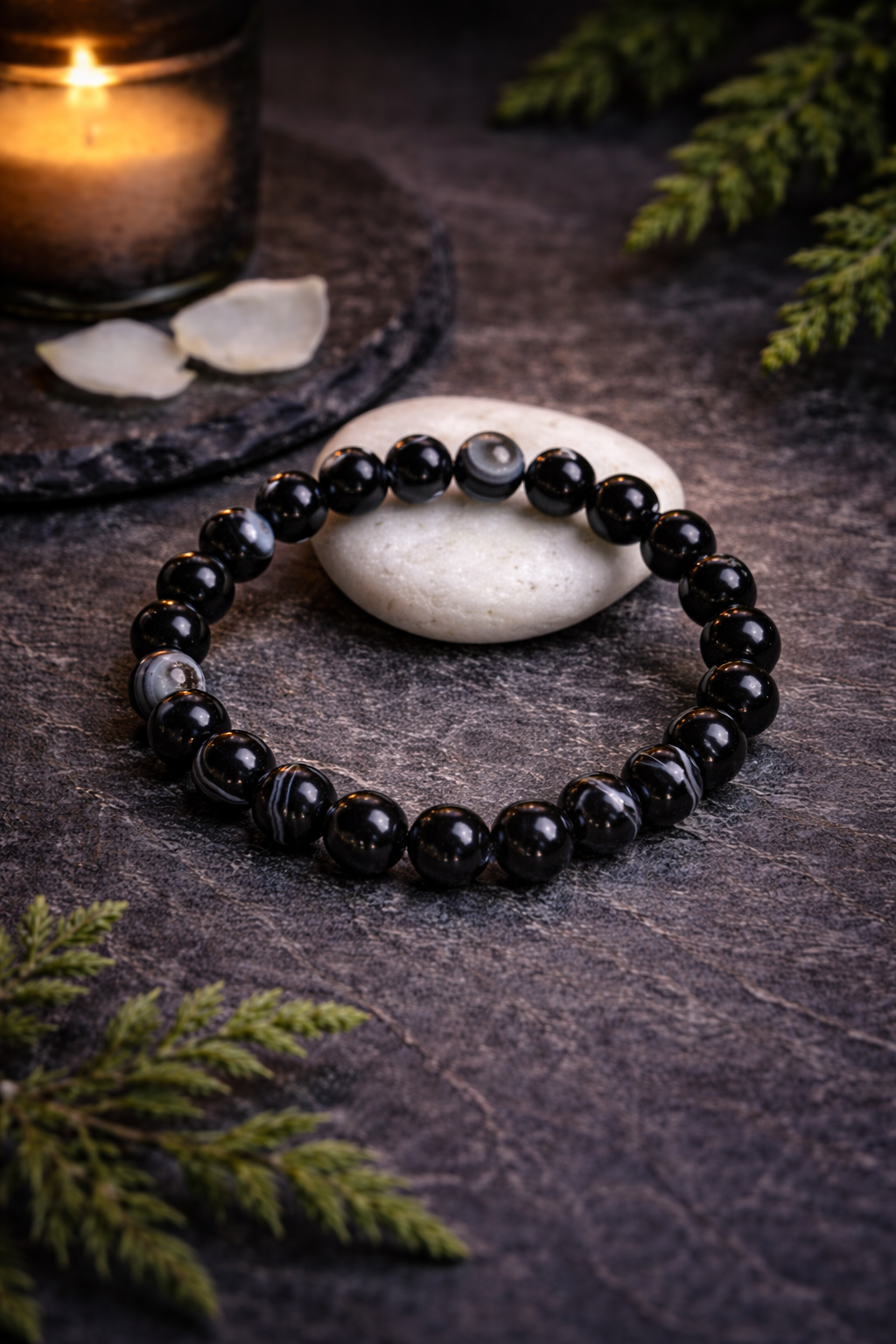 Black Banded Agate is a deeply grounding stone admired for its rich black tones and naturally layered bands, symbolizing balance and strength built over time. Its calm, steady appearance reflects resilience and inner stability.