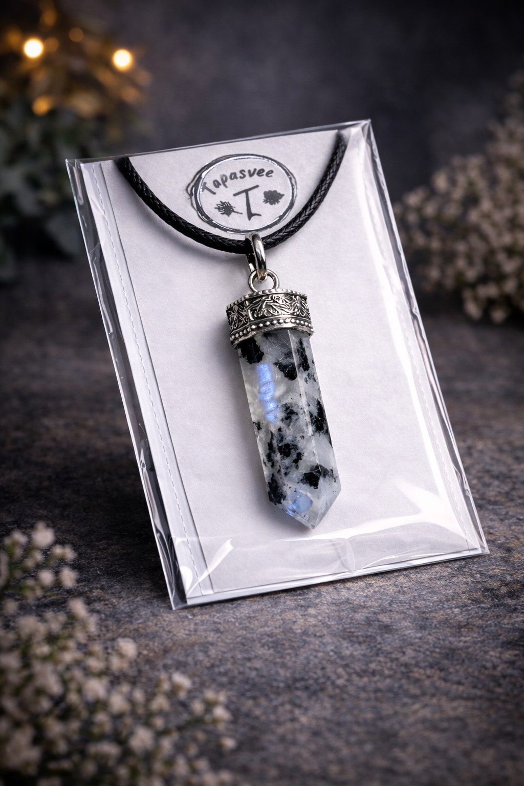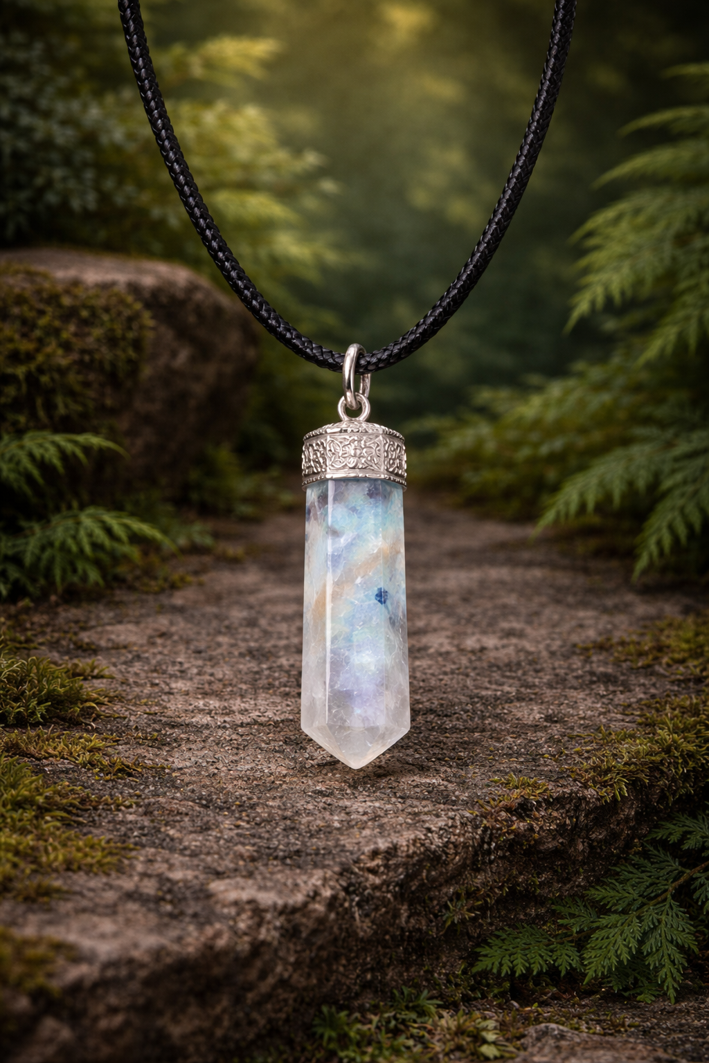 The Rainbow Moonstone pencil pendant is a calming crystal known for soothing emotions and bringing inner harmony. It is believed to help stabilize mood swings, reduce stress, and encourage emotional healing. Wearing this pendant may promote peace, self-awareness, and gentle positive energy, making it ideal for daily wear and emotional well-being.